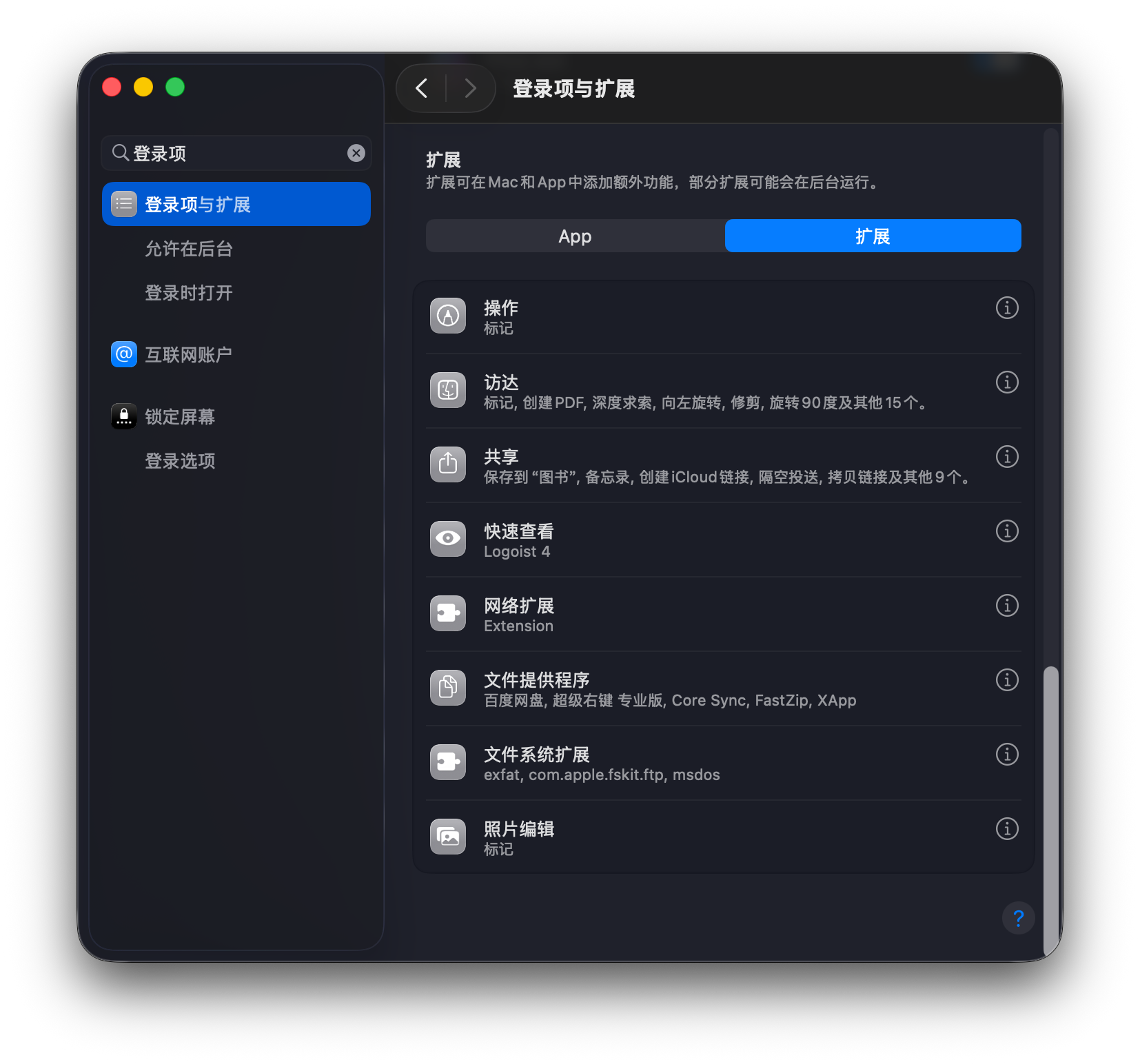 Fastzip 访达扩展设置发表时间:2026-02-01 16:47 Fastzip的访达扩展和超级右键同理(这里我们以超级右键为例子) MacOS26Macos升级到26及以上版本可以通过系统设置来自由开关访达扩展打开系统设置-通用-登录项与扩展-文件提供程序,如下图所示