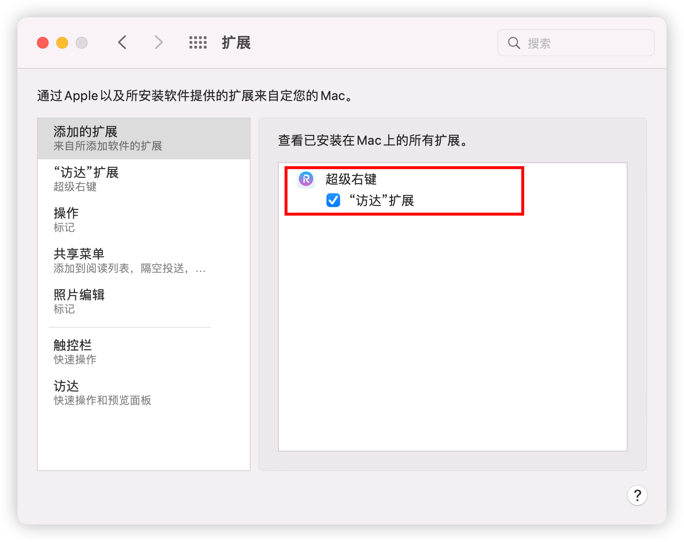 3.选择访达扩展,勾选超级右键,如果这里你的已经勾选上了,那就去掉勾选,重新勾一次,勾选完,重启访达试一下