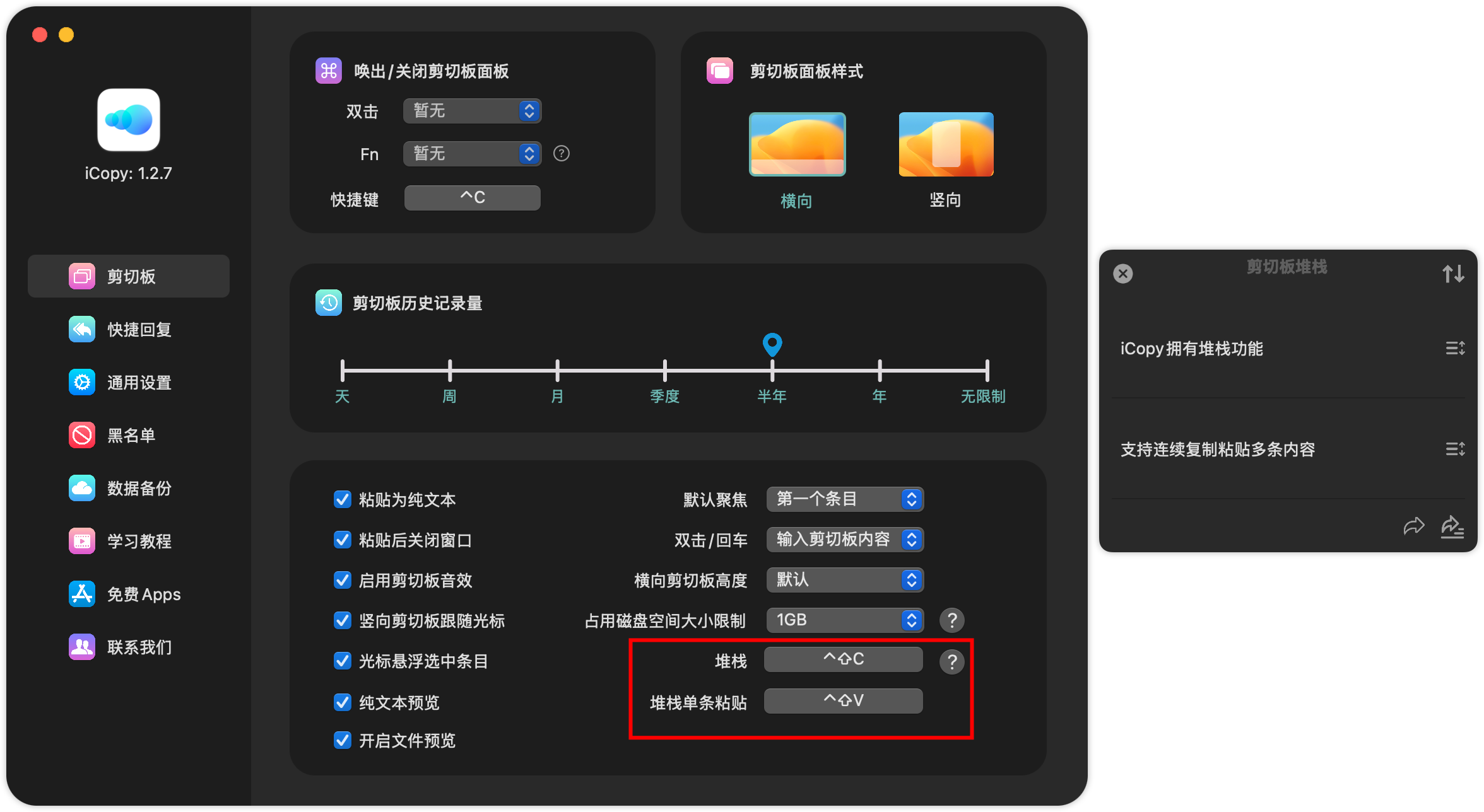 iCopy可以通过自定义快捷键来打开堆栈功能,实现连续复制多个内容的效果