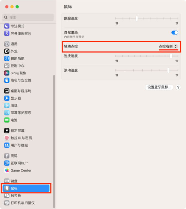 macOS 12及以下:点击屏幕左上角苹果图标,点击【系统偏好设置】,点击【鼠标】,在【光标与点按】中勾选【辅助点按】,并设置为【点按右侧】。 (3)普通鼠标macOS 13:点击屏幕左上角苹果图标,点击【系统设置】,在左侧栏最下方找到【鼠标】,点击进入,在【光标与点按】中将【辅助点按】设置为【点按右侧】。 使用鼠标在桌面右击,出现系统右键菜单,代表设置成功 macOS 12及以下:点击屏幕左上角苹果图标,点击【系统偏好设置】,点击【鼠标】,在【鼠标主按钮】设置为【左】。 使用鼠标在桌面右击,出现系统右键菜单,代表设置成功。 |