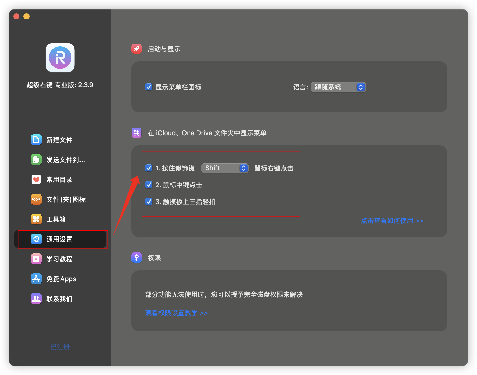 ⚠️注意事项:勾选【在iCloud、One Drive 文件夹中显示菜单】后,超级右键会被设置为开机自启动。 1.按住修饰键+鼠标右键点击按住修饰键(command、shift、option、control)同时鼠标右键点击(适用于普通鼠标和妙控鼠标)按住修饰键(command、shift、option、control)同时使用触控板、妙控板的辅助点按