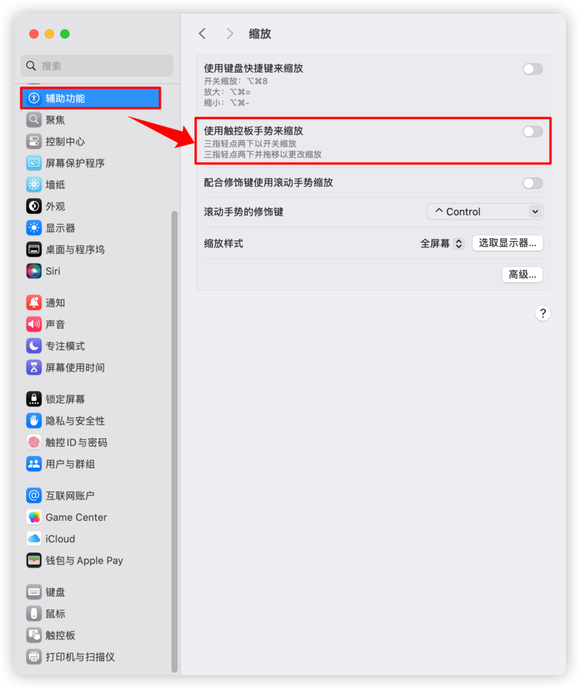 ⚠️注意事项:若您开启了系统的三指轻点缩放功能,会对三指轻拍调出超级右键菜单产生影响,请您关闭系统的三指轻点缩放功能。