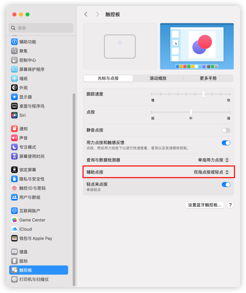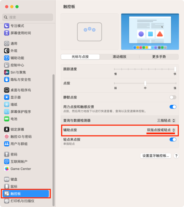 2. 设置系统右键菜单(1)触控板macOS 13:点击屏幕左上角苹果图标,点击【系统设置】,在左侧栏最下方找到【触控板】,点击进入,在【光标与点按】中将【辅助点按】设置为【双指轻点或点按】(或点按左下角、点按右下角)。 在桌面,双指点按或轻点触控板会出现系统右键菜单,代表设置成功。