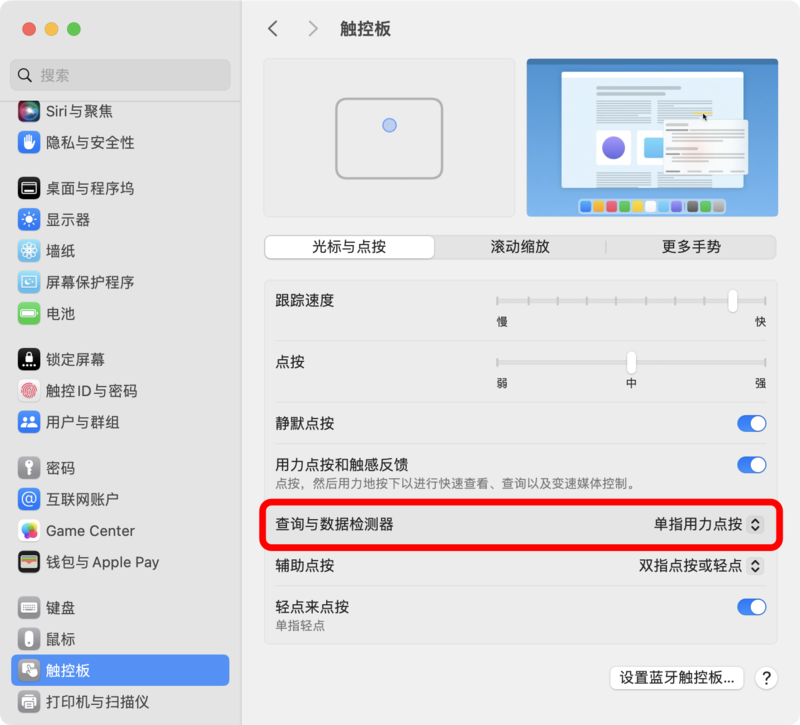 3.触控板、妙控板上三指轻拍/三指点按在触控板、妙控板上使用三指点按/三指轻拍,即可唤出超级右键菜单。⚠️注意事项:此时如果您的【查询与数据检测器】手势同样是三指轻点,会在选中文件时发生冲突,您可以将手势修改为【单指用力点按】来避免冲突。