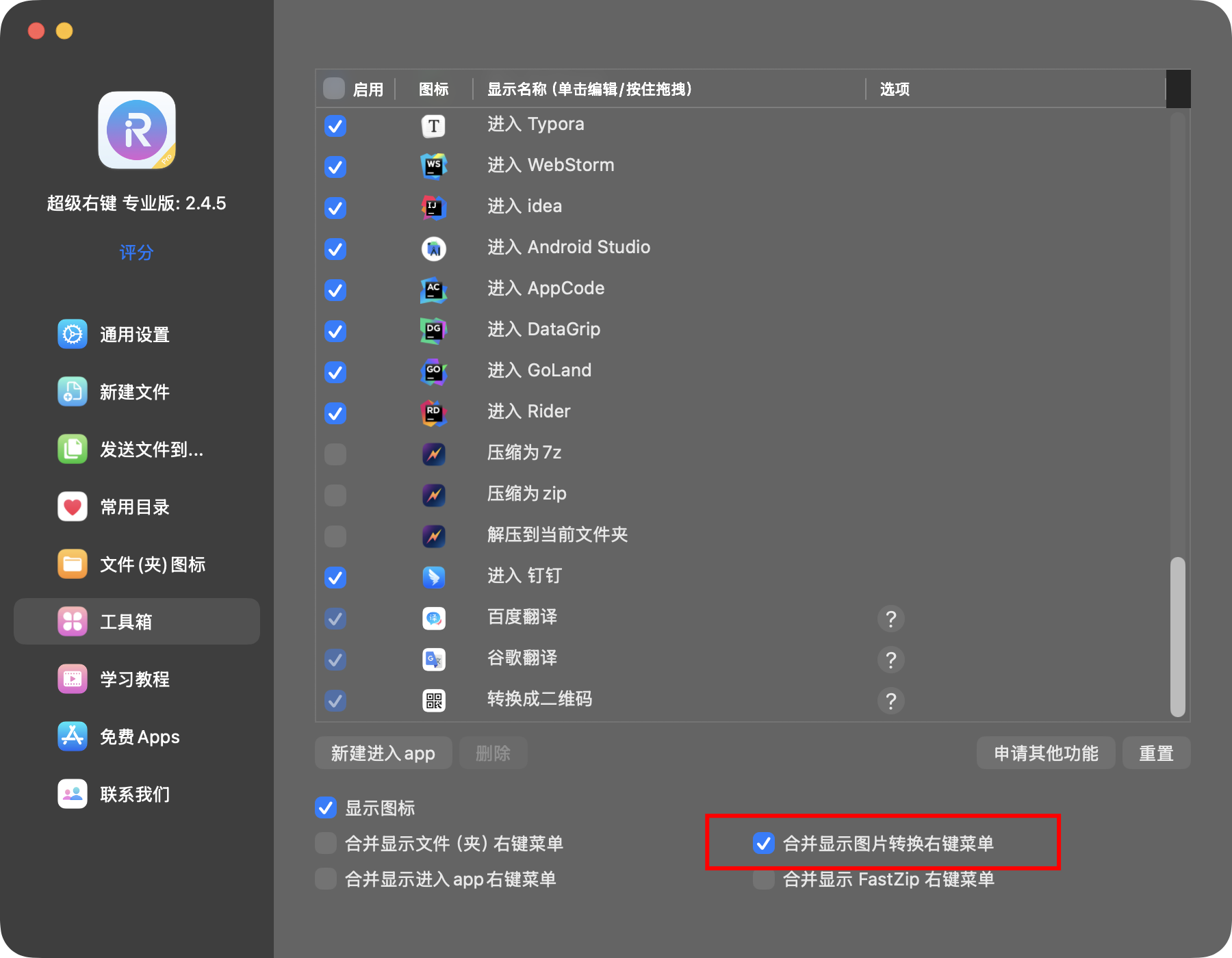 在超级右键的工具箱中,可以选是否合并显示图片转换右键菜单